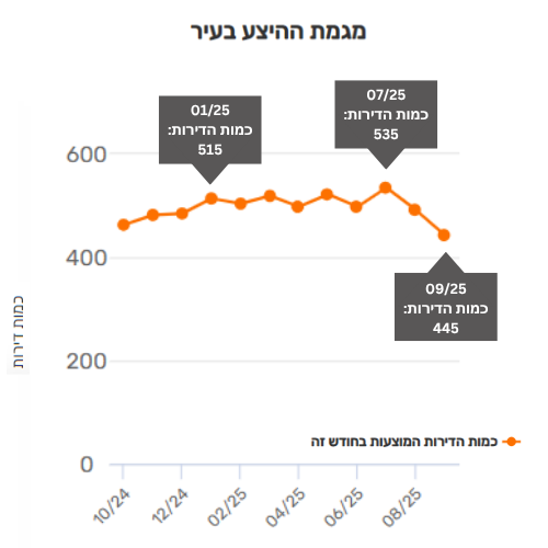 - בחודש יולי נרשם שיא בהיצע עם 535 דירות שהוצעו למכירה ולאחר מכן בחודשיים האחרונים של רבעון 3/25 ירדה כמות הדירות המוצעת עד שפל של 445 דירות בלבד, שהוצעו בספטמבר.