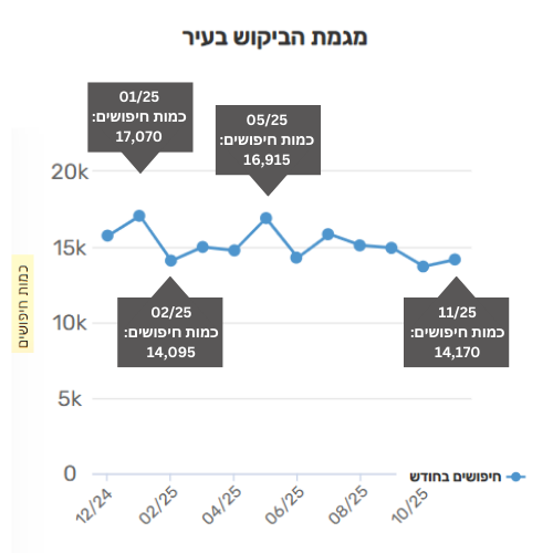 - ברבעון השלישי של 2025 נעו הביקושים על כמות של כ-15,300 מחפשים מידי חודש בממוצע.