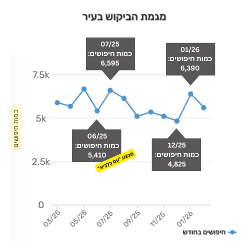 - בינואר 2026 זינק הביקוש לכמות של כ-6,390 מחפשים ובפברואר האחרון ירד ל- 5,595 מחפשים.