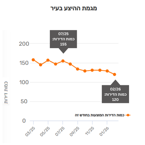 - במחצית הראשונה של 2025 נרשמה מגמה מעורבת של היצעי דירות – כאשר מידי חודש הוצעו בין 145 ל-165 דירות.
