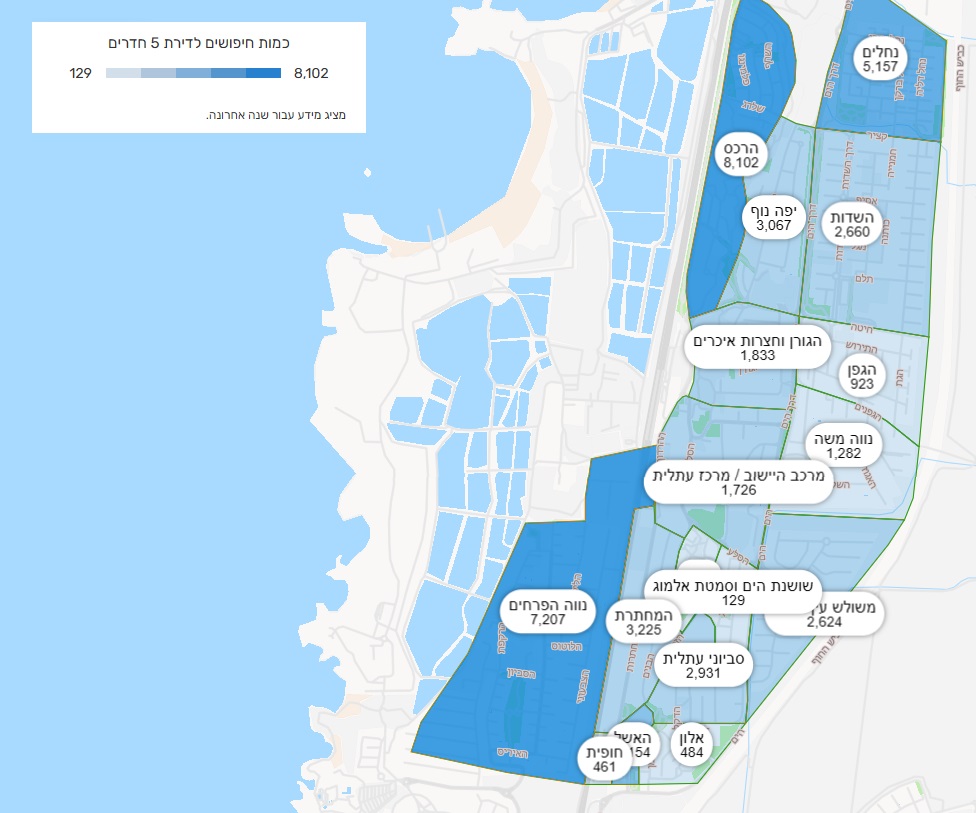 ממוצע חודשי – כמות חיפושים לדירות 5 חד' על פני שכונות העיר