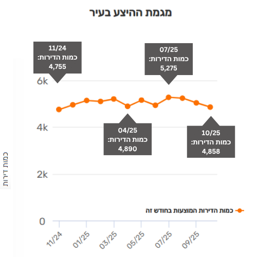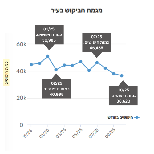 - בחודש יולי עלו הביקושים, עם כמות של 46,455 מחפשים, ולאחר מכן ירידה רציפה עד חודש אוקטובר האחרון בו נרשם שפל בביקושים עם כמות של כ-36,620 מחפשים אחר דירה לרכישה בעיר.