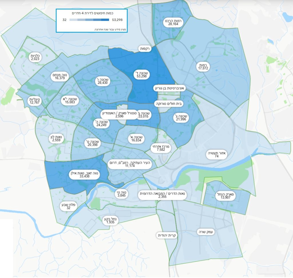 ממוצע חודשי – כמות חיפושים לדירות 4 חד' על פני שכונות העיר