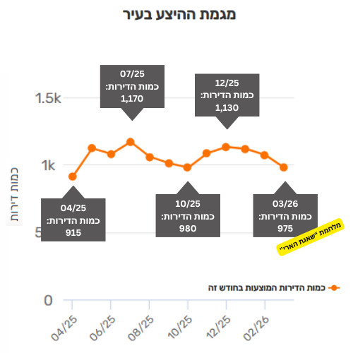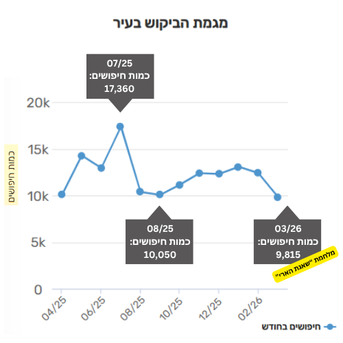 - בתחילת 2026 נרשמה עלייה קלה בביקוש בחודש ינואר ולאחר מכן ירידה מחודשת, עם שפל של כ-9,815 מחפשים בלבד בחודש מרץ האחרון.