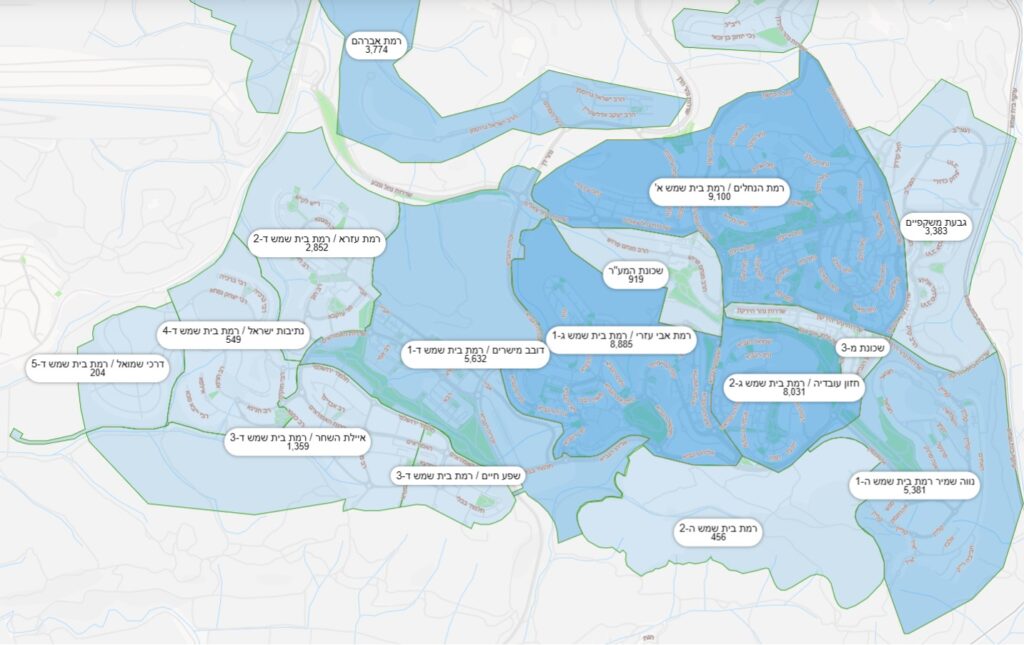 רמת משה / בית שמש הוותיקה > רמת אבי עזרי / רמת בית שמש ג-1 > קרית אריה / שיינפלד > רמת הנחלים / רמת בית שמש א' > גבעת שרת > דובב מישרים / רמת בית שמש ד-1