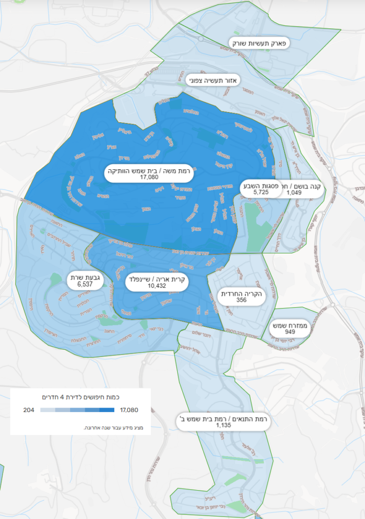 ממוצע חודשי – כמות חיפושים לדירות 4 חד' על פני שכונות העיר