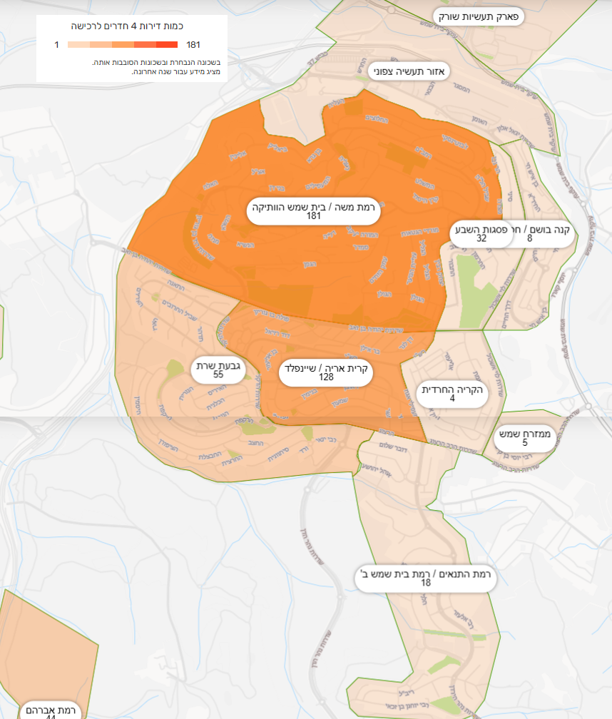 *בשכונת רמת משה / בית שמש הוותיקה ההיצע הגבוה ביותר לדירות יד שנייה, עם כ-535 דירות שהוצעו למכירה בשנה האחרונה לעומת כ-300 דירות בשכונת קרית אריה / שיינפלד.