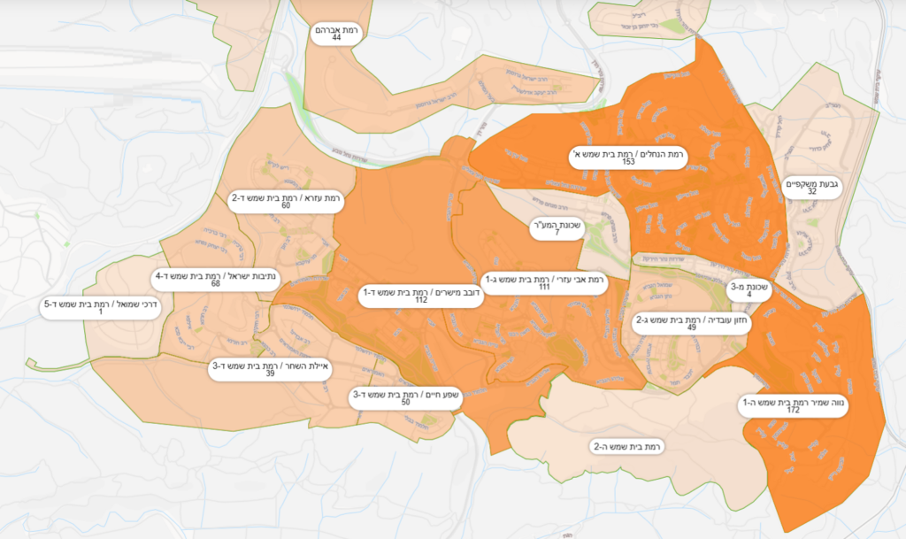 רמת משה / בית שמש הוותיקה > נווה שמיר רמת בית שמש ה-1 > דובב מישרים / רמת בית שמש ד-1 > רמת הנחלים / רמת בית שמש א' > רמת אבי עזרי / רמת בית שמש ג-1 > קרית אריה / שיינפלד
