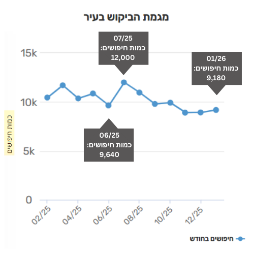 - במחצית הראשונה של 2025 הציגו הביקושים מגמה מעורבת, בטווח שבין 9,640 מחפשים (חודש יוני) ל-11,700 מחפשים (חודש מרץ).