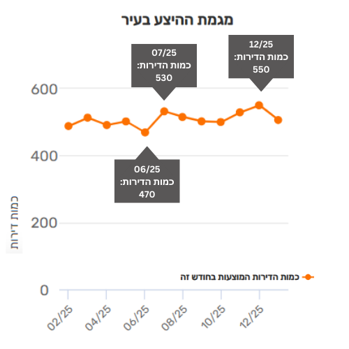 - במחצית הראשונה של 2025 נרשמה מגמה מעורבת של היצעי דירות – כאשר מידי חודש הוצעו בין 470 (יוני) ל-515 דירות (מרץ).