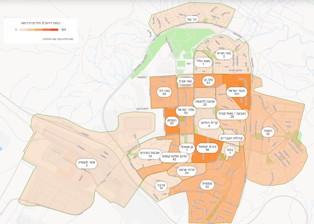 היצע דירות בנות 3 חד' מיד שנייה בשכונות העיר בשנה האחרונה – בממוצע חודשי