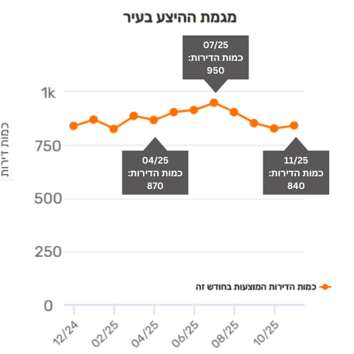 - בחודשים אפריל – יולי השנה נרשמה מגמת עלייה בהיצעים מידי חודש, עם שיא של כ-950 דירות מוצעות למכירה בחודש יולי.