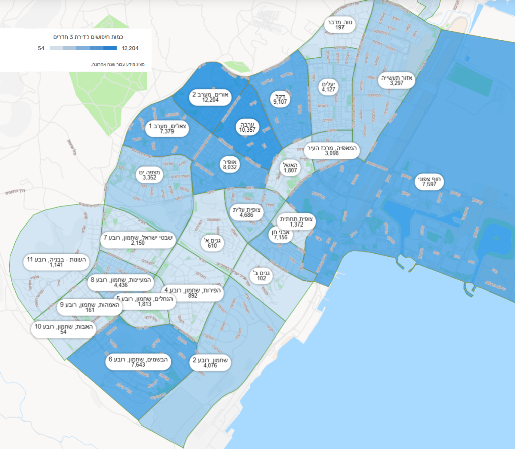 ממוצע חודשי – כמות חיפושים לדירות 3 חד' על פני שכונות העיר