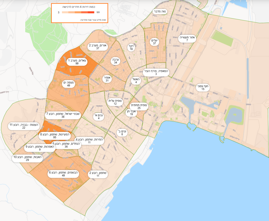 היצע דירות בנות 4 חד' מיד שנייה בשכונות העיר בשנה האחרונה – בממוצע חודשי