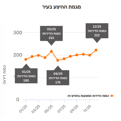 • ברבעון הראשון של 2025 עלה היצע הדירות מידי חודש – עם כמות של כ-200 דירות שהוצעו בחודש מרץ.