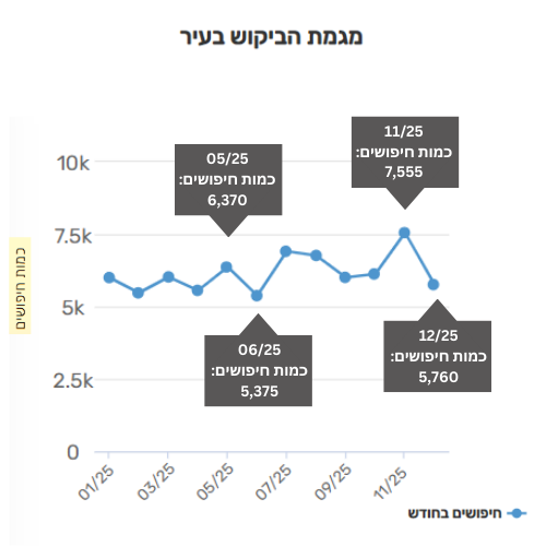 • שיא הביקושים במהלך שנת 2025 נרשם בחודש נובמבר והשפל בחודש יוני.
