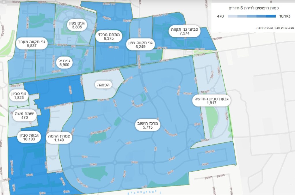 ממוצע חודשי – כמות חיפושים לדירות 5 חד' על פני שכונות העיר