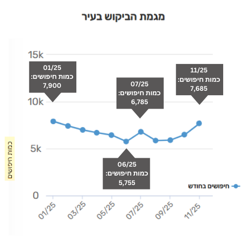 • בחודש יולי עלתה כמות המחפשים לכ-6,785 והחל מחודש אוגוסט כמות המחפשים עלתה בעקביות, עם כ-7,685 מחפשים בחודש נובמבר האחרון.