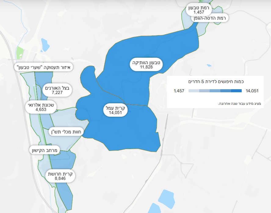 ממוצע חודשי – כמות חיפושים לדירות 5 חד' על פני שכונות העיר