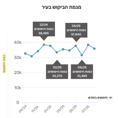 - לאחר עלייה בחודש מאי צנחו הביקושים בחודש יוני לכ-31,485 מחפשים ובחודש יולי שבה ועלתה כמות המחפשים.