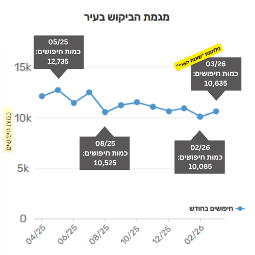 • בחודשים נובמבר ודצמבר נרשמה ירידה קלה וברבעון הראשון של 2026 המשך תנודתיות עם עלייה קלה בינואר ולאחריה שפל של כ-10,085 מחפשים בחודש בפברואר.