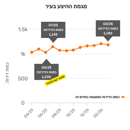 • ברבעון הראשון של 2026 נשמרה רמת היצע גבוהה יחסית, סביב כ-1,170–1,200 דירות, עם ירידה קלה בחודש מרץ האחרון בו הוצעו כ-1,180 דירות.