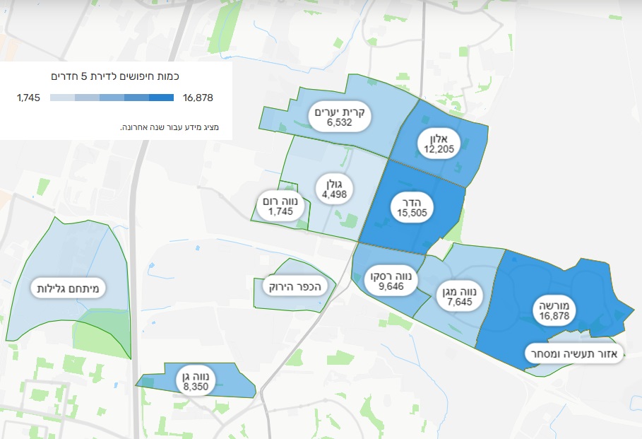 ממוצע חודשי – כמות חיפושים לדירות 5 חד' על פני שכונות העיר