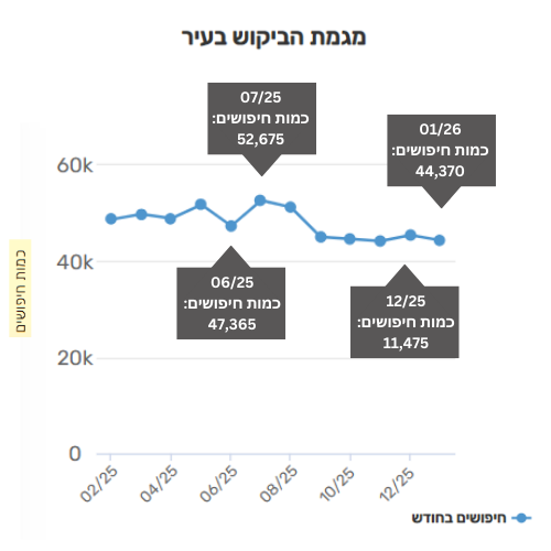 - בחמשת החודשים האחרונים של שנת 2025 נע מספר המחפשים אחר דירה בעיר מידי חודש בטווח שבין 52,980 (בחודש ינואר) ל-48,720 (בחודש פברואר).