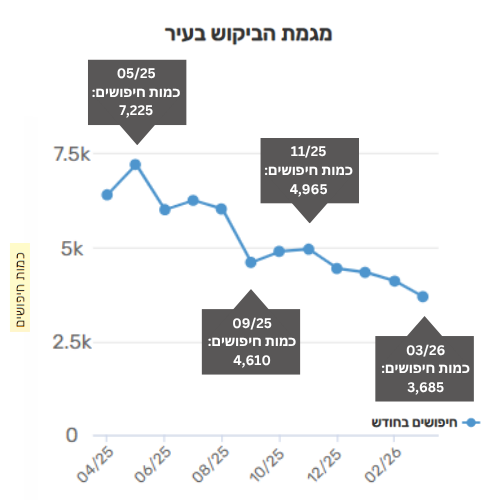 • החל מחודש דצמבר 2025 ועד חודש מרץ האחרון נרשמה ירידה רציפה בביקוש, עם שפל של כ-3,685 מחפשים בלבד בחודש מרץ.