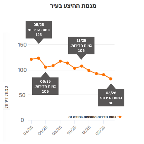 • מחודש נובמבר 2025 ועד חודש מרץ האחרון נרשמה ירידה רציפה בהיצע הדירות, עם שפל של כ-80 דירות בחודש מרץ.