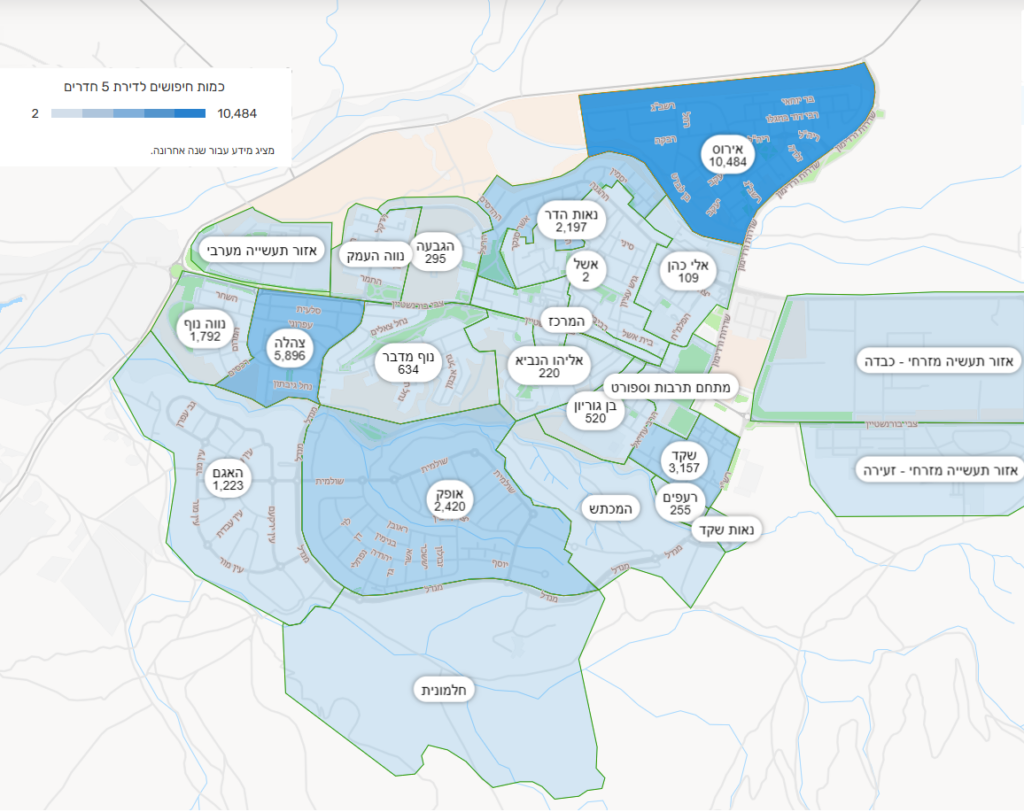 ממוצע חודשי – כמות חיפושים לדירות 5 חד' על פני שכונות העיר